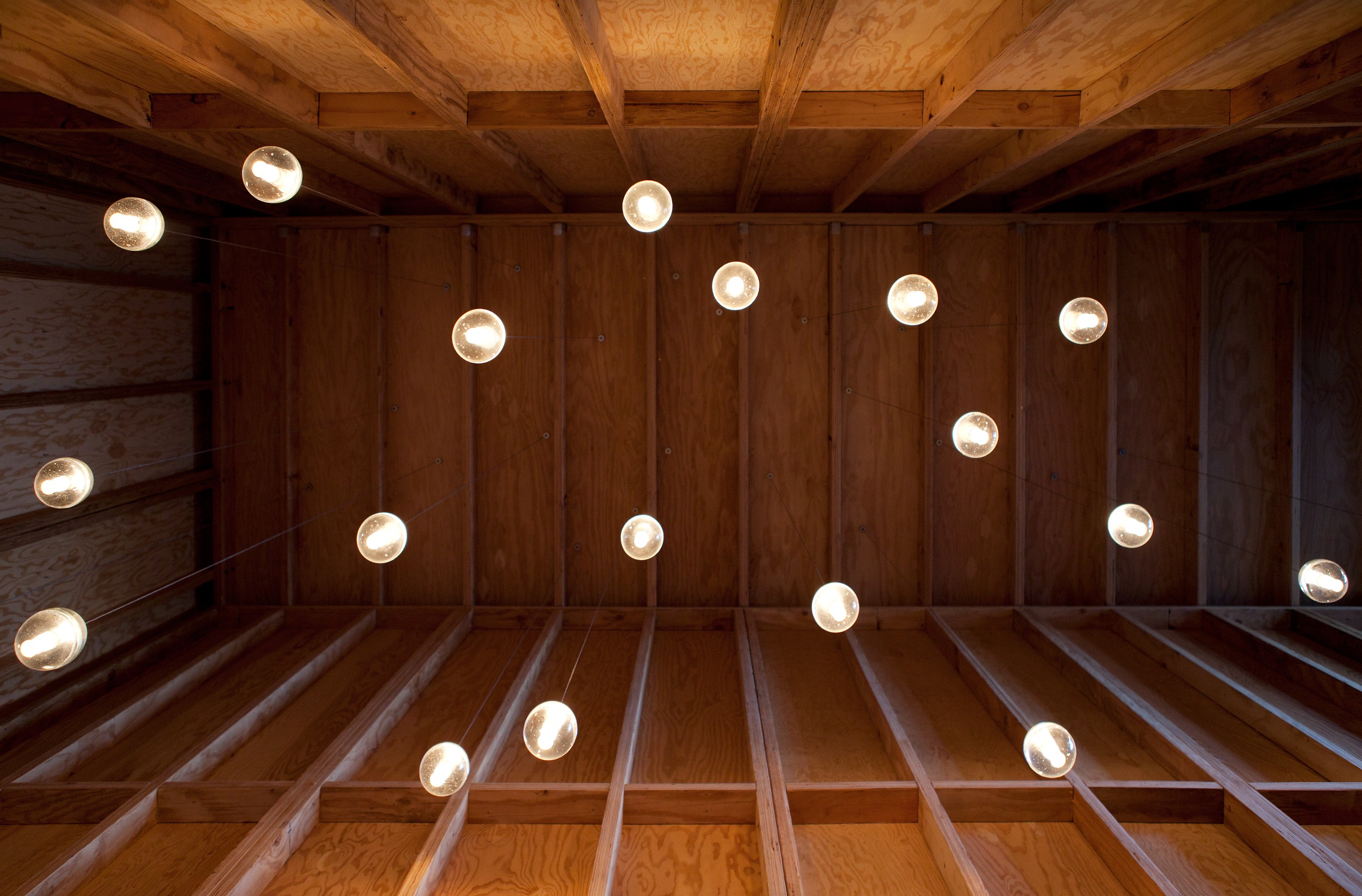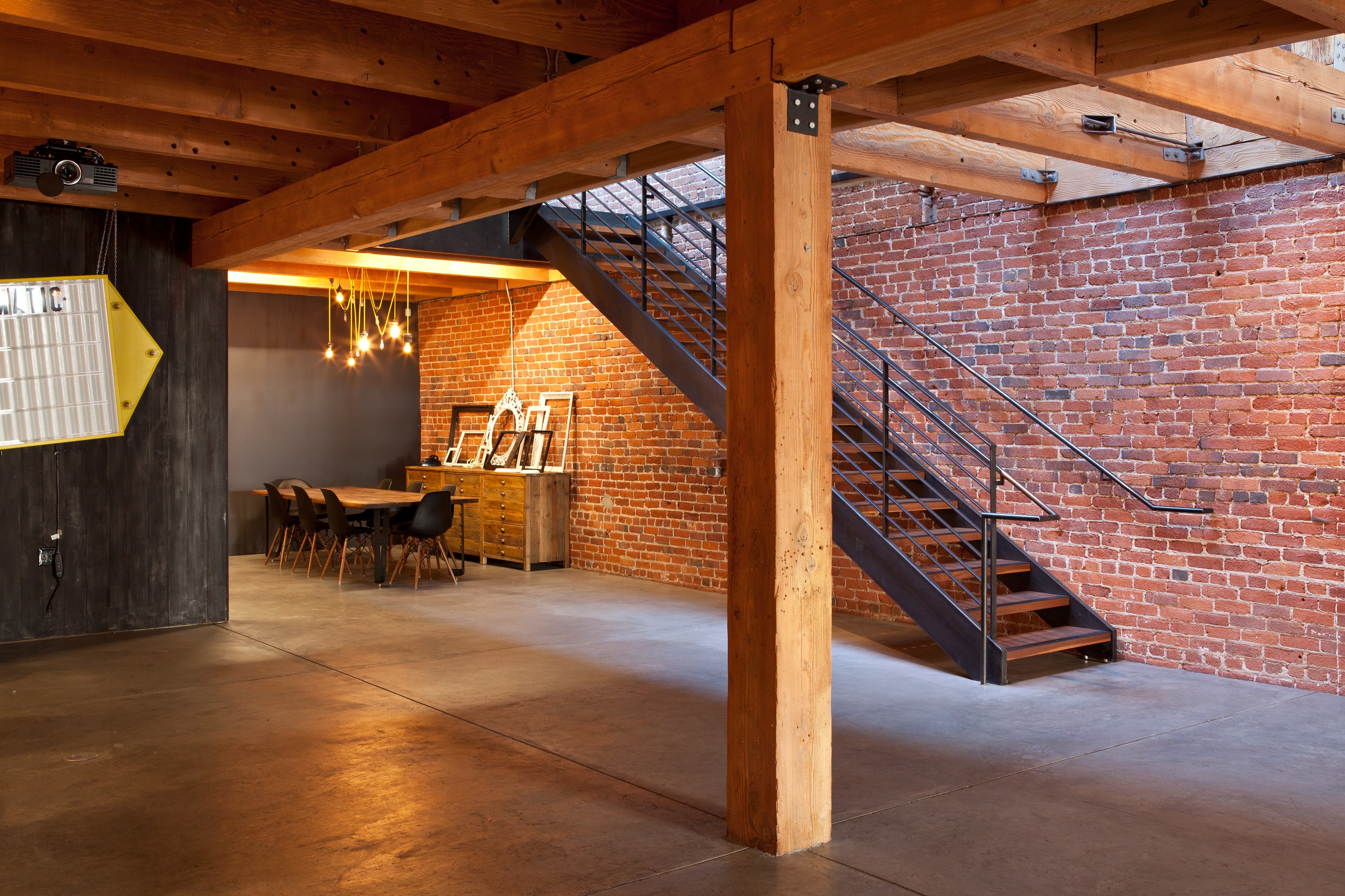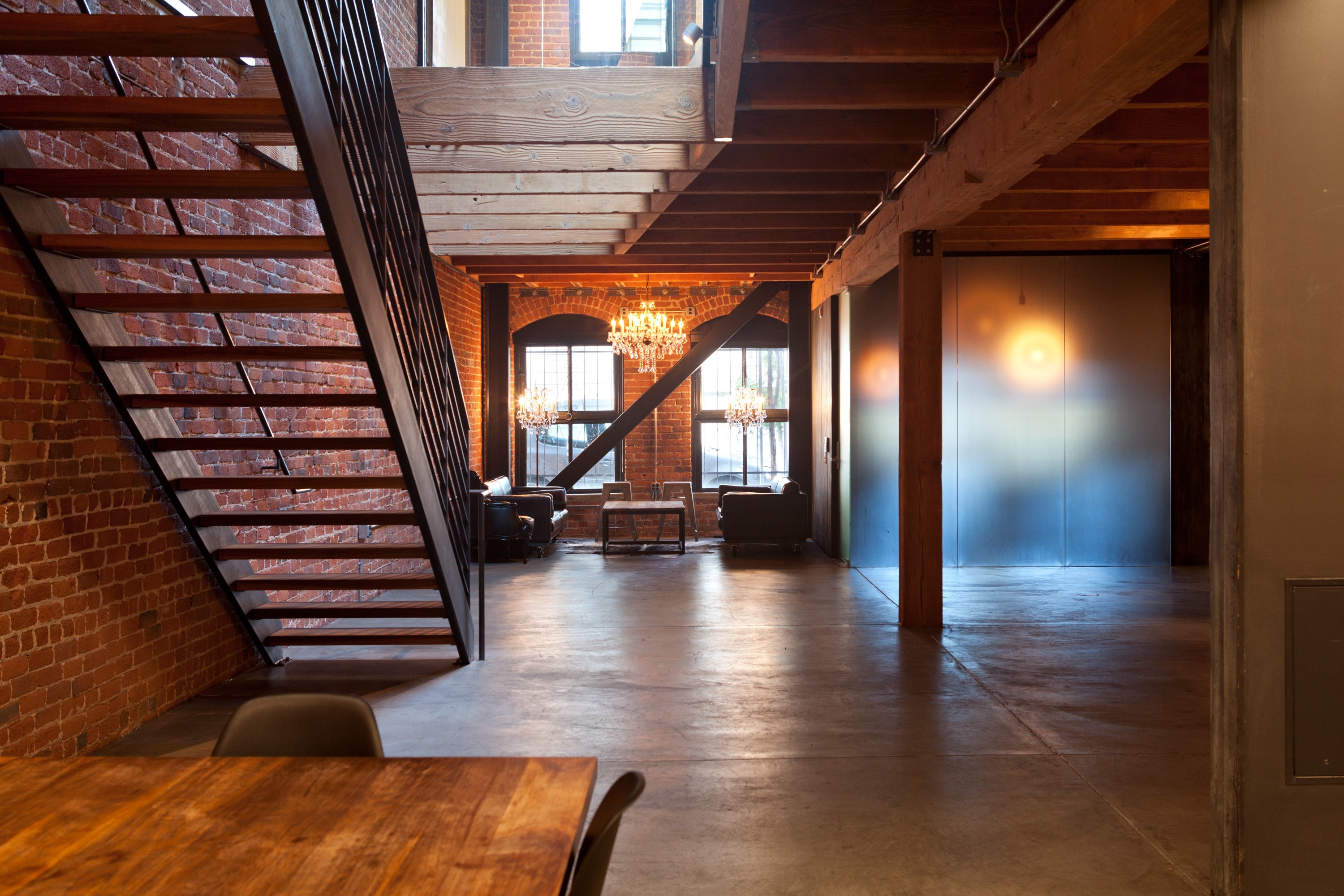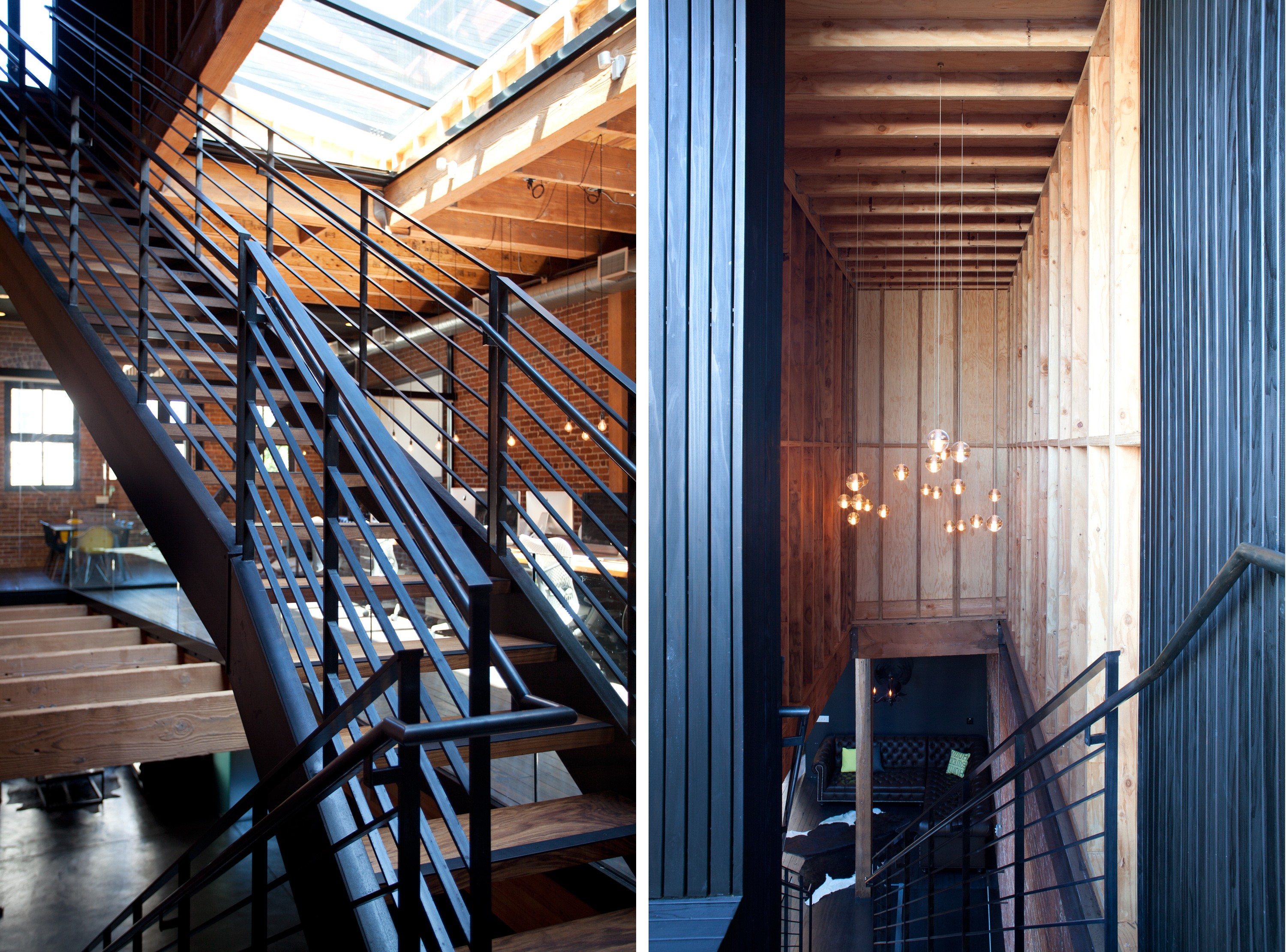 The rustic yet contemporary atmosphere is solidified by coarse brick walls, which date back to the building's 1908 construction as a casket manufacturing business. This feel continues through the newly installed interior wall siding, which is charred for a matte black quality through a carbonizing process. Shelter and openness are as intermeshed as work and play at Synthetic; huge cut-outs in the ground floor's ceiling break the barrier between upstairs and down, with a slim steel staircase joining the two levels and roof.